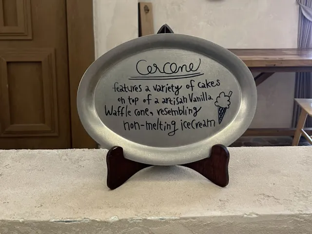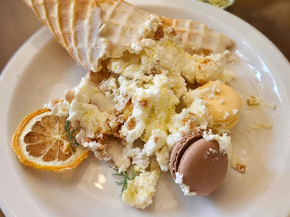 プレートに盛られたワッフルコーンを砕いてチーズムースと一緒に食べるスタイル。サクサクの食感と濃厚なムースが合わさって最後まで飽きない。