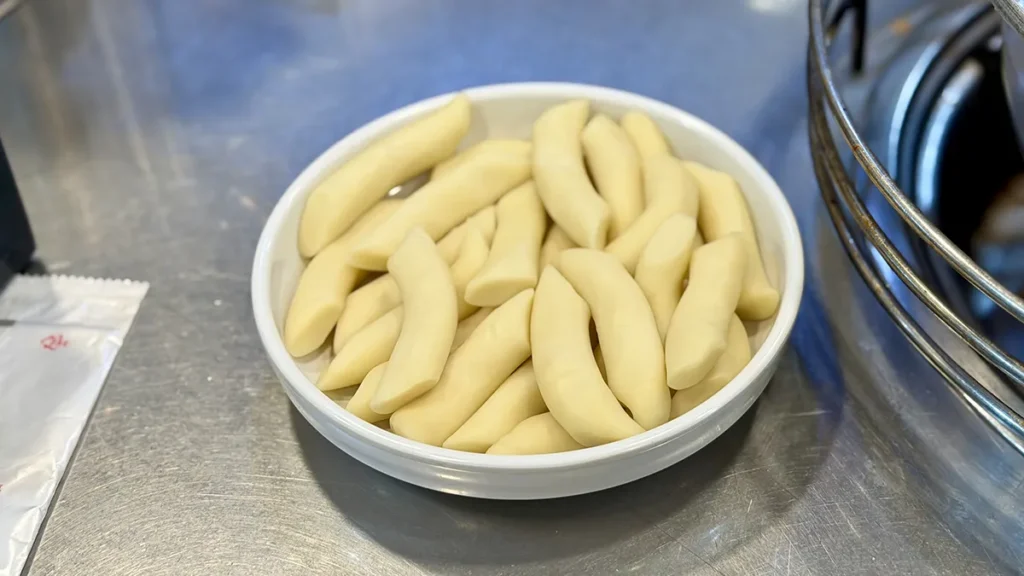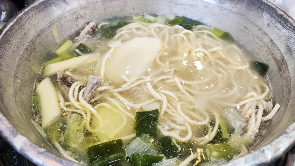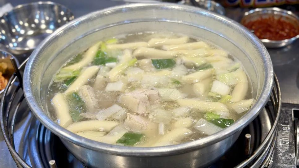 スープはかなり透明寄り。隣のお店だと黄色っぽいスープも多いから、「ここはあっさり路線なんだな」って見た目で分かる。基本の具は鶏+じゃがいも少しだけ。日本の方だと「タッカンマリ=餅も野菜もたっぷり」のイメージがあるかもだけど、ここは追加前提のシンプル鍋。私はトッサリ(餅)とカムジャサリ(じゃがいも)を追加。ネギ追加も好きな人はかなり満足度上がる。