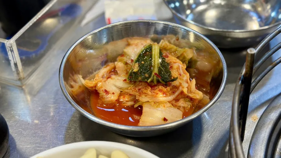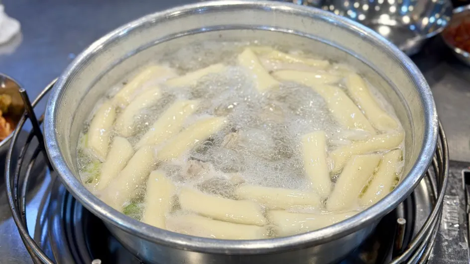ピークど真ん中っぽいのに、番号もらって5分くらいで案内されたのが意外だった。店内は韓国人・日本人・その他の旅行者がだいたい同じくらいで、東大門らしい国際色。席に座って荷物を椅子の中にしまって振り返ったら、もう鍋がドン。ここも「座ったら始まる」タイプ。