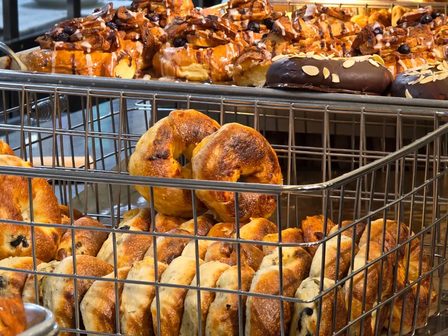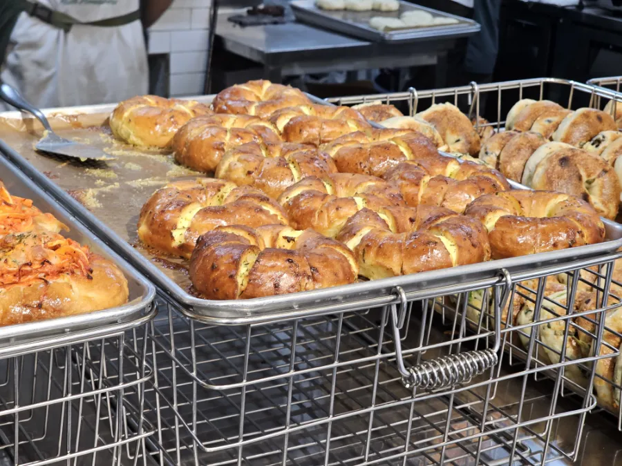 店に入った瞬間、目を引くのは巨大な火窯。イタリアの火山灰で作られたらしく、そこでスタッフさんたちが絶え間なくベーグルを焼いている。2年以上研究した結果だそうで、確かに普通のベーグルとは全然違う。小麦粉特有の匂いがなくて、窯焼きピザの生地みたいに外はカリッと、中は信じられないほどモチモチ。パンというよりお餅に近いような、新感覚の食感だった。